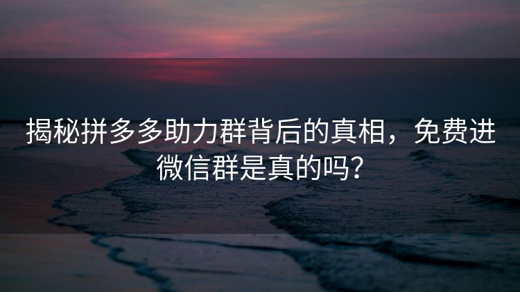 随着互联网电商的飞速发展,拼多多作为其中的佼佼者,凭借其独特的社交电商模式赢得了广大消费者的喜爱,在这样的背景下,一种名为“拼多多助力群”的微信群逐渐兴起,宣称免费加入,并承诺在群内享受助力砍价的特权,引发了不少网友的好奇和关注,免费进这类微信群是真的吗?背后又隐藏着怎样的真相呢?本文将为您揭开这层面纱。
